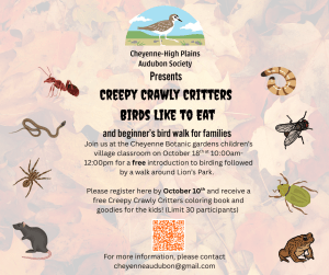 Join us at the Cheyenne Botanic Gardens Children’s Village classroom on October 18th from 10:00am-12:00pm for a free introduction to birding followed by a walk around Lion’s Park. Please register using the QR code or link by October 10th and receive a free Creepy Crawly Critters coloring book and goodies for the kids! (Limit 30 participants). Register at https://forms.gle/hrpPhpqWyMcpz9z36