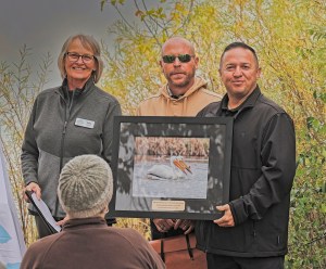 At right: Vicki Herren, IBA Chair with Brandon Peterson, City of Cheyenne Parks Manager and Jason Sanchez, Director of Cheyenne Department of Community Recreation and Events, accepting a framed photo of two American Pelicans by Kirk Miller.